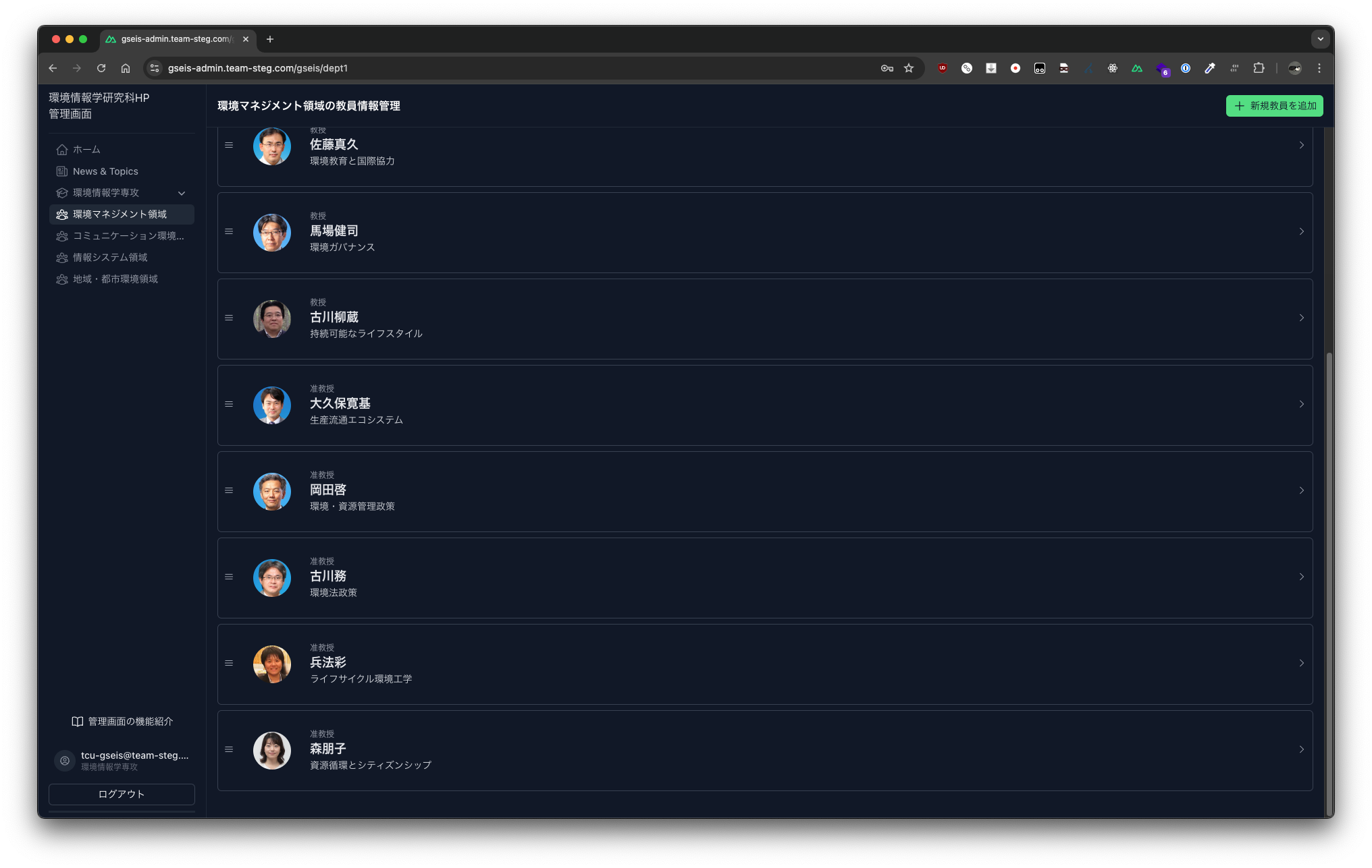 環境情報学研究科 Webサイト管理画面では、以下2箇所の教員情報を登録・編集・削除することができます。