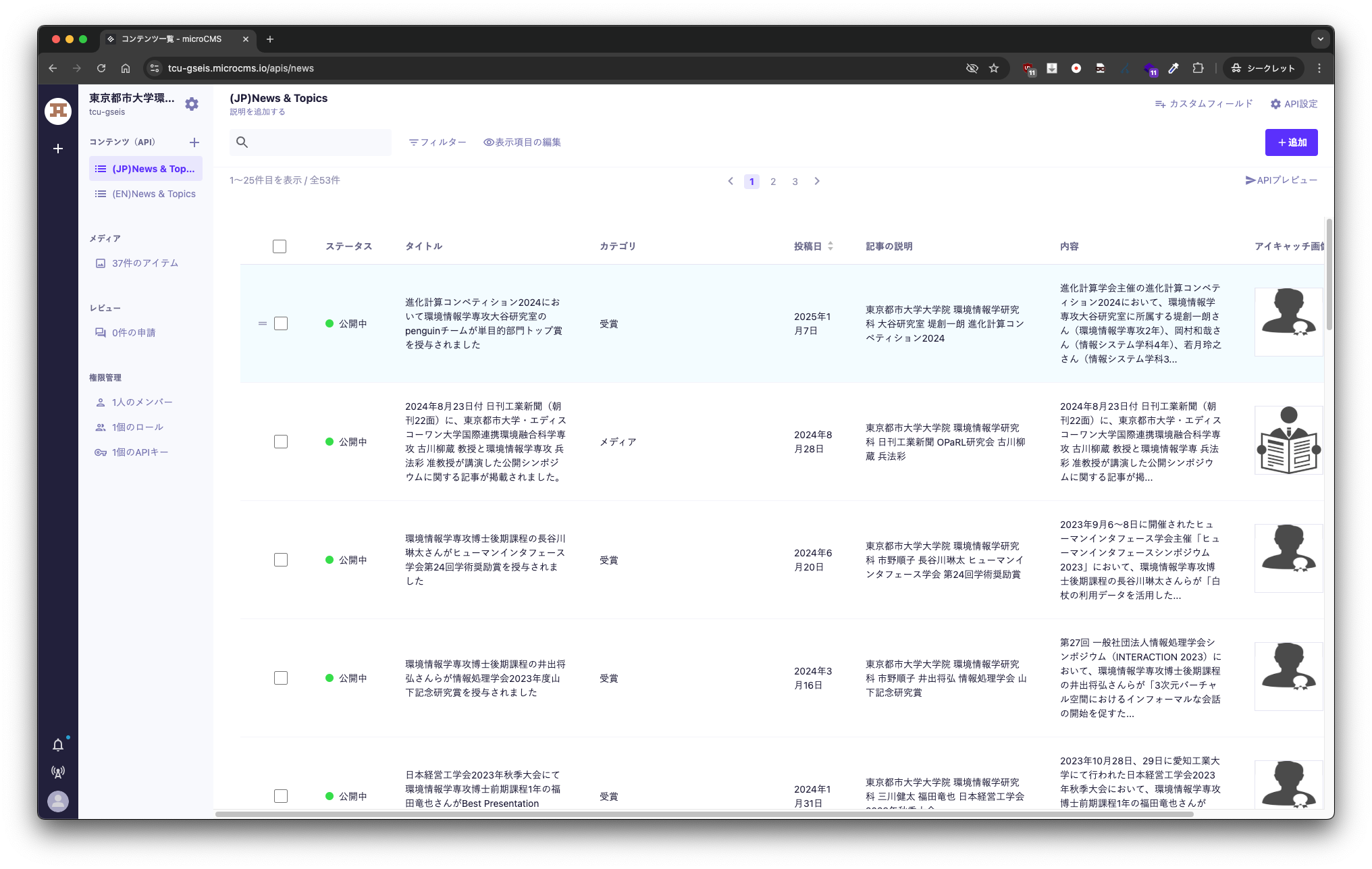 環境情報学研究科トップページに表示されるNews & Topicsは、microCMSという外部サービスを使用して管理しています。